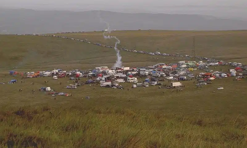 Travellers arrived with their stalls and a mini economy of food, clothes and other traveller wares as well as the usual rave paraphernalia developed. Rings of camp fires marked travellers villages that formed in growing circles around the centre. TV crews from all major news stations arrived and covered the event, which was the lead story on BBC news on both the Friday and Saturday night. The crowd was a mixture of New Age travellers, gypsies, and urban dwelling rave enthusiasts from across the country.
