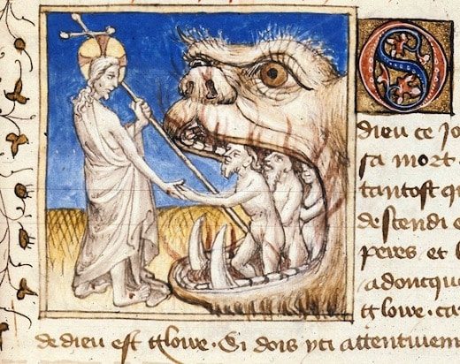 Above: A more “grotesque” styled representation of the Harrowing of Hell in a medieval manuscript, typical of the artistic style that backed the dramatic view.